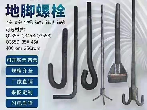 地腳螺栓的用途主要有以下幾方面:固定地腳螺栓又稱為短地腳螺栓,它與基礎澆灌在一起,用來固定沒有強烈振動和沖擊的設備。活動地腳螺栓又稱為長地腳螺栓,是一種可拆卸的地腳螺栓,用于固定工作有強烈振動和沖擊的重型機械設備。脹錨地腳螺栓往往被用于固定靜置的簡單設備或輔助設備。
